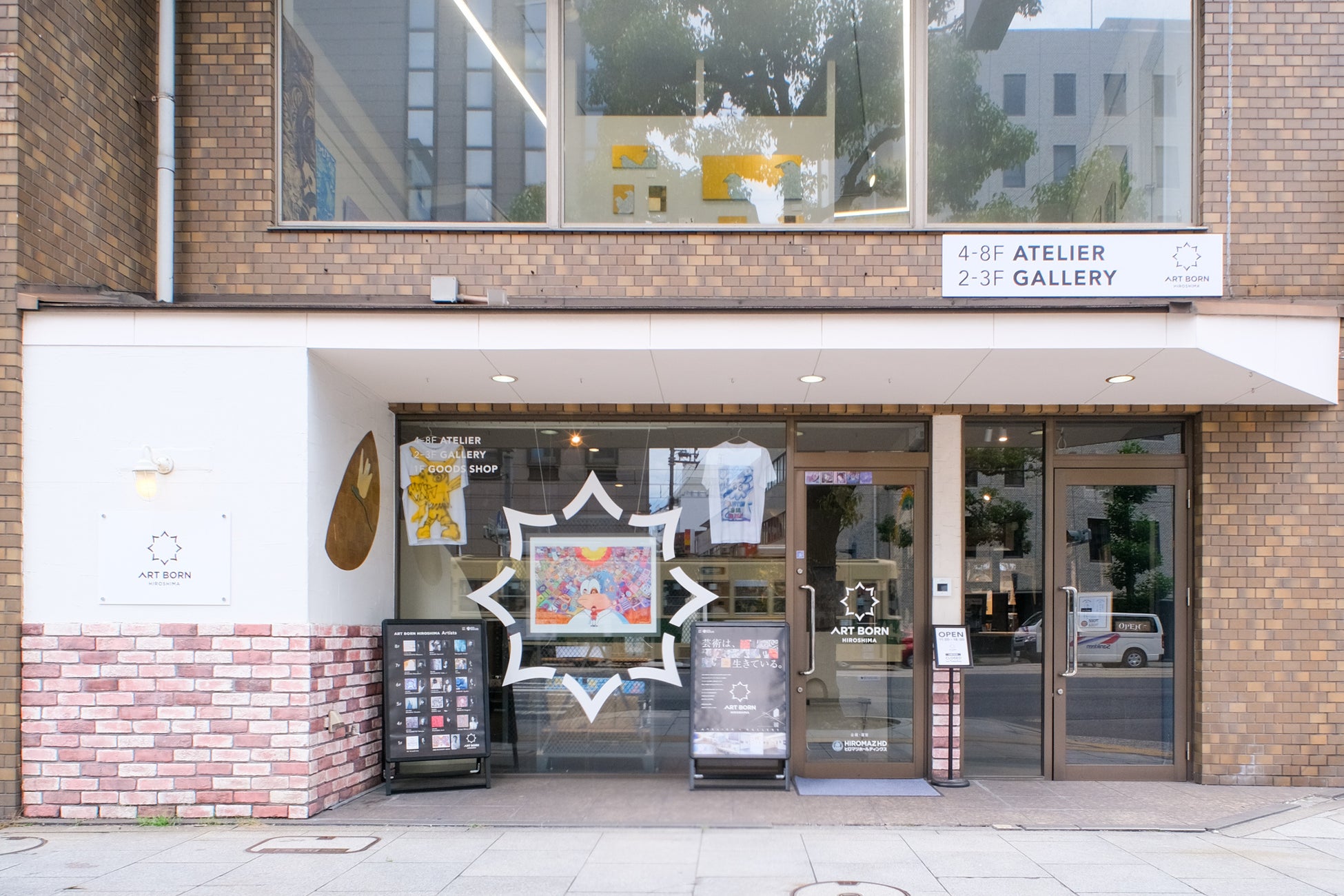 2024年11月にオープンしたアート施設『ART BORN HIROSHIMA』(広島市中区幟町14-3)は、8階建てのビル内にアトリエ・ギャラリーの他、カフェやバーなどを併設するスポットで、ヒロマツホールディングスが企画・運営を行っている。1階はグッズショップ・カフェ、2~3階はギャラリー、4~8階がアトリエとなっており、営業時間中は全館無料で観覧可能。