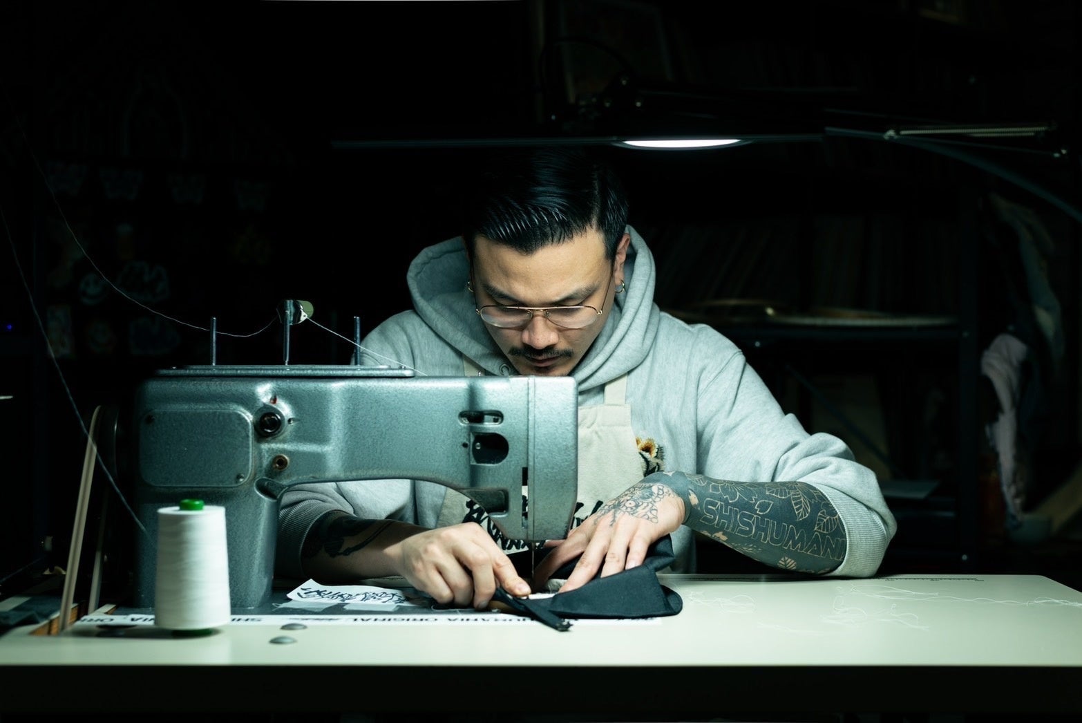 福盛さんの出身は宮崎県。パイロットになりたくて15歳の時に埼玉の航空自衛隊の養成学校に入隊した。学校で階級が上がるたびに階級章を縫い付けていて、その時余った糸を使ってふと始めた手縫いの刺繍がスタートだった。適正検査をパスできずパイロットの夢は諦めたものの、卒業後に横振りミシンに出会い、この道へ。2015年にSHISHUMANIAとして起業し、東京で10年間活動後、縁がありちょうど大阪・関西万博のタイミングで大阪に拠点を移したところだそう。