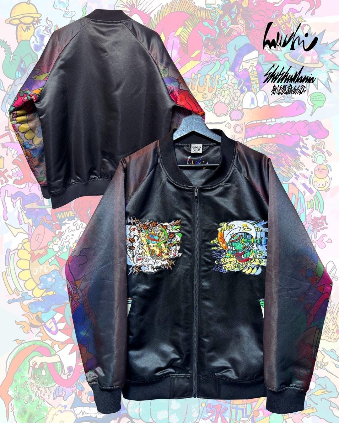 トルソーに着せられた黒いスカジャン。胸にはMUSASHIが“風神雷神”をテーマに描いたアートが、精細な刺繍で再現され、両腕の部分には浮かび上がるようなプリントが施されていた。MUSASHI×SHISHUMANIAのコラボ作品だ。